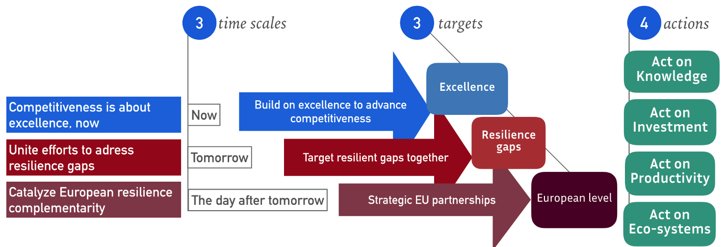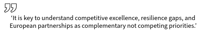 The approach rejects binaries between competitiveness and resilience, emphasising instead their interdependence. Excellence provides the foundation for global competitiveness today; resilience ensures targeted investment and sustainability against systemic vulnerabilities tomorrow; and strategic European partnerships enable the complementarity and scale required the day after.