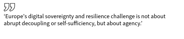 Europe’s digital sovereignty and resilience challenge is not about abrupt decoupling or self-sufficiency, but about agency and the capacity to shape technological foundations. That capacity has been weakened by fragmented markets, under-scaled investments, dependencies shaped by geopolitical dynamics and false binaries between competitiveness and resilience that prevent Europe from strategically leveraging its strengths.