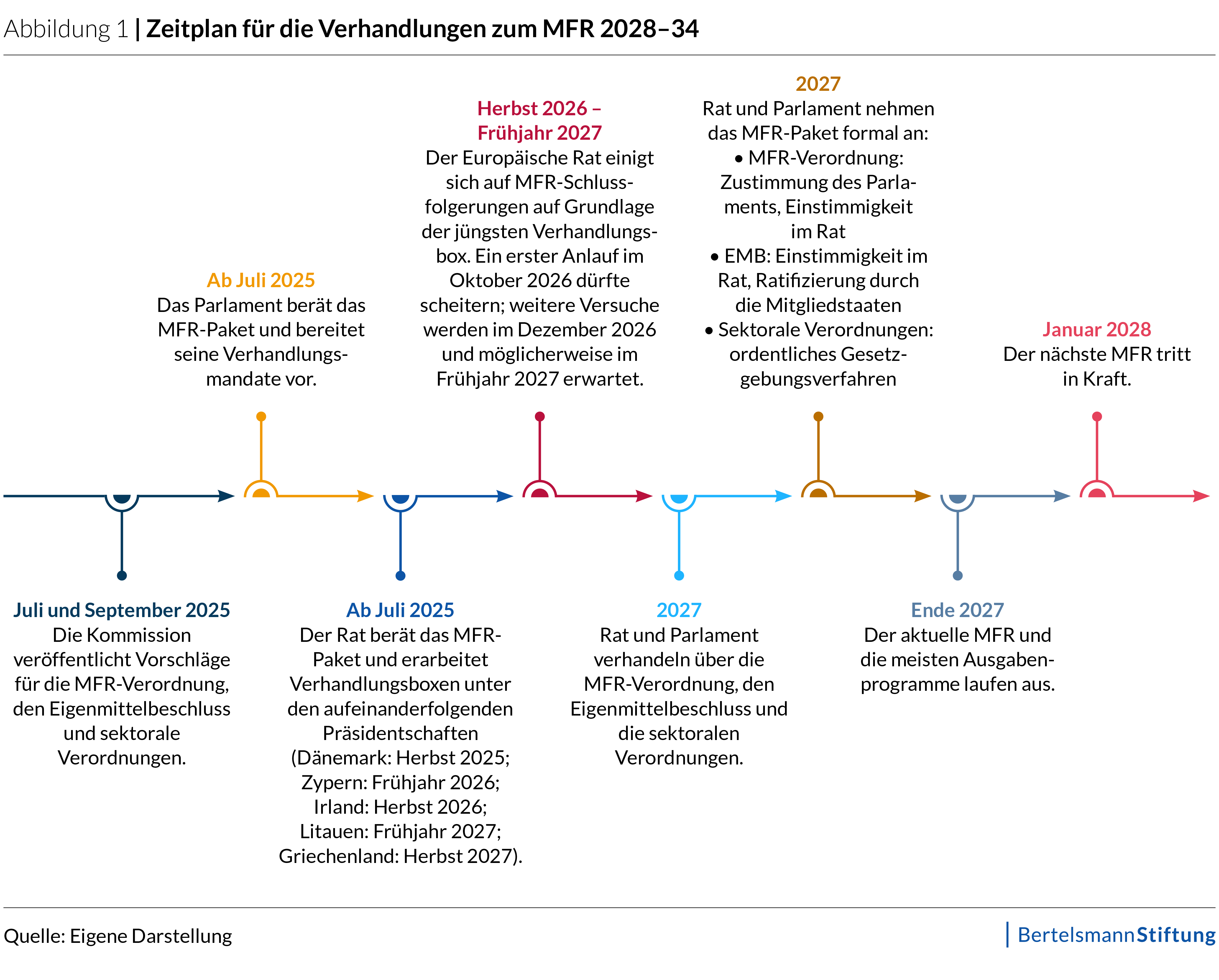 Der aktuelle MFR läuft Ende 2027 aus, ebenso wie die meisten Ausgabenprogramme. Rechtlich gesehen könnte die EU danach weiterhin Ausgaben tätigen und ausstehende Zahlungsverpflichtungen im Rahmen der Obergrenzen des alten MFR erfüllen. Ohne einen neuen MFR kann die EU jedoch keine neuen Programme aufsetzen, was die Planbarkeit für Zielgruppen stark einschränkt und das Risiko von Finanzierungslücken mit sich bringt. Der EMB dagegen hat kein Ablaufdatum. Bis zur Verabschiedung eines neuen EMB sind die Mitgliedstaaten weiterhin verpflichtet, Beiträge im Rahmen des derzeit geltenden Beschlusses zu leisten.