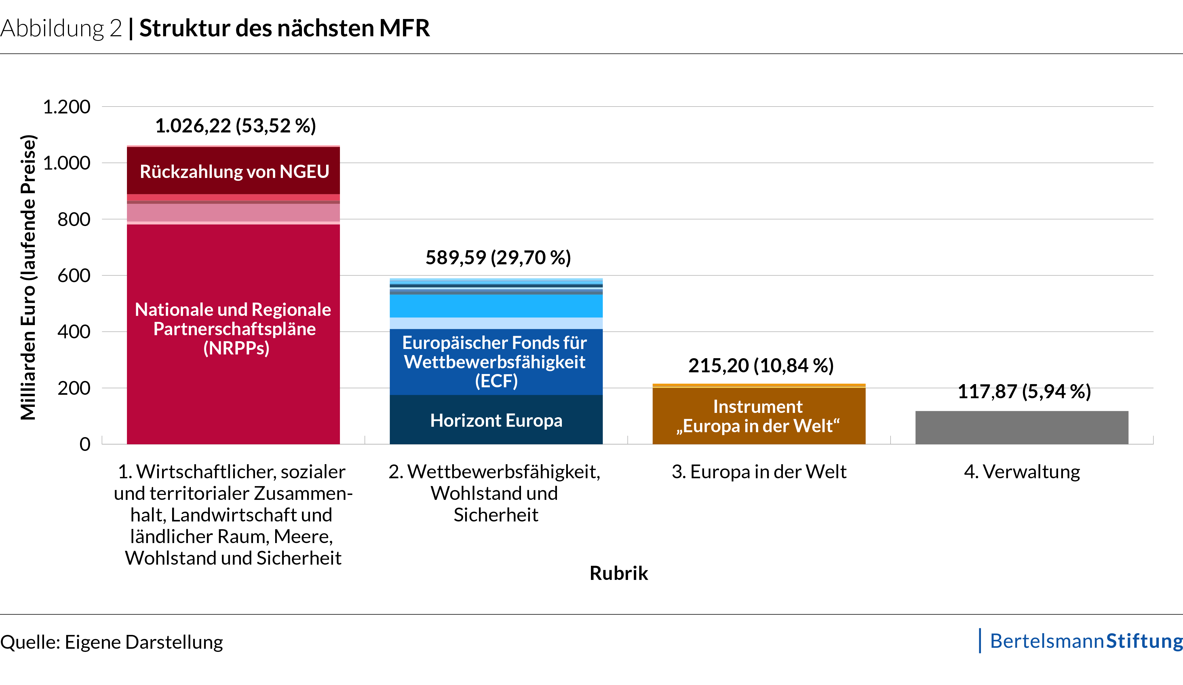 Vor diesem Hintergrund hat die Europäische Kommission im Sommer 2025 einen ehrgeizigen Vorschlag für den nächsten MFR veröffentlicht. Er sieht umfassendere Reformen vor als in jedem früheren Zyklus. Dazu gehört neben einem größeren Haushalt von 1,26 % des Bruttonationaleinkommens (BNE) (einschließlich 0,11 % für NGEU-Rückzahlungen) gegenüber 1,12 % im aktuellen MFR eine radikale Vereinfachung der Struktur des Haushalts, damit Mittel effizienter genutzt und bei neuen Herausforderungen flexibler eingesetzt werden können. Um Gelder strategischer verwenden zu können, schlägt die Kommission außerdem vor, den Schwerpunkt von traditionellen Bereichen wie der Gemeinsamen Agrarpolitik und der Kohäsion auf die Wettbewerbsfähigkeit und Verteidigung zu verlagern.