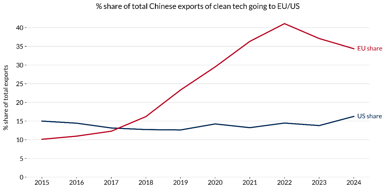 • At the same time, China’s oversupply of many clean tech products – from electric vehicles to solar panels – has increased. This puts EU-based manufacturers under pressure from low-cost, often subsidised competition, and risks deepening Europe’s dependency on Chinese tech. Due to US trade barriers, cheap Chinese exports are being redirected towards Europe, amplifying these pressures.