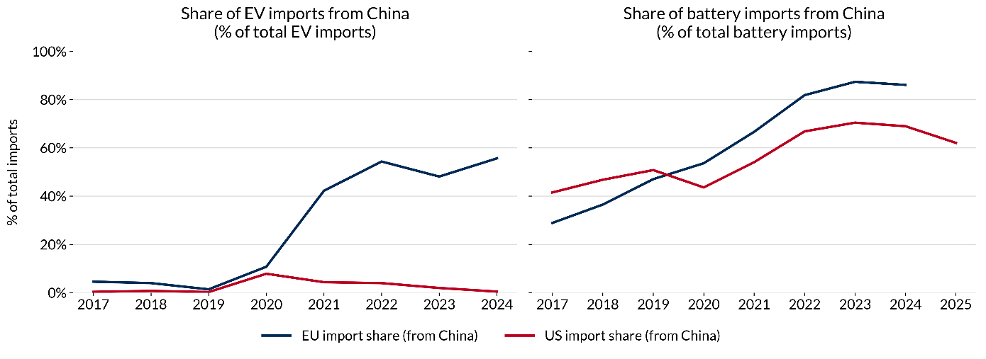 Chart 3: diverging trade patterns in EU and US markets for EVs and batteries