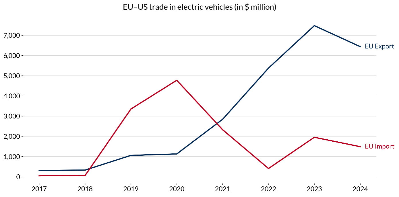 Chart 5: EU exports of EVs to the US have surged in recent years while imports declined