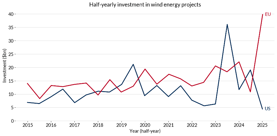 Chart 7: EU investment in wind parks spiked in early 2025, while US investment dropped