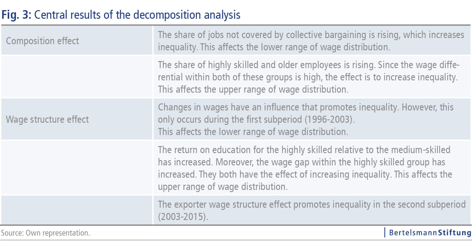 While we were only able to identify a very limited influence for companies’ international engagement on the growth of wage inequality, the influence did increase during the more recent time segment. Yet even if the determined direct effect of international trade on the inequality trend turns out to be moderate, it is conceivable that increased international integration through interdependencies with the changed institutional environment has an indirect relevance for the development of inequality.